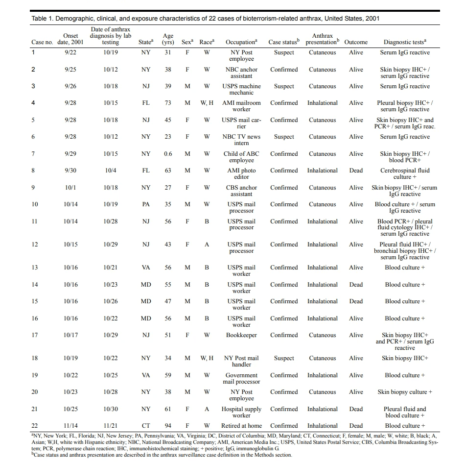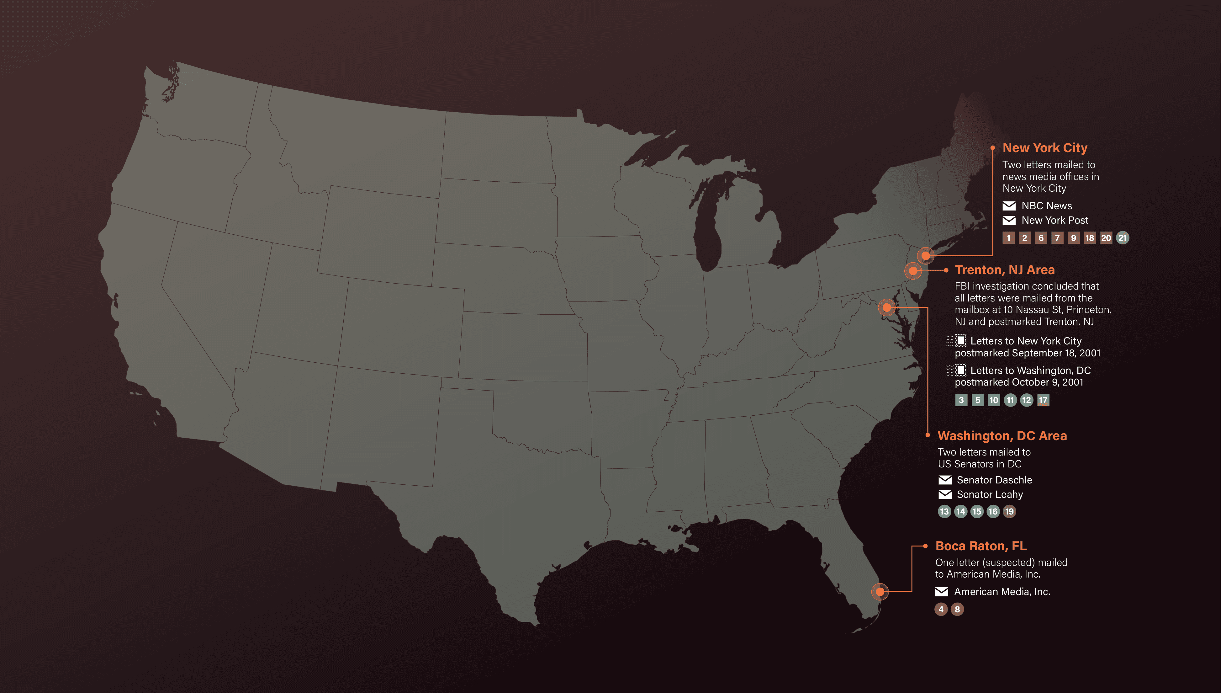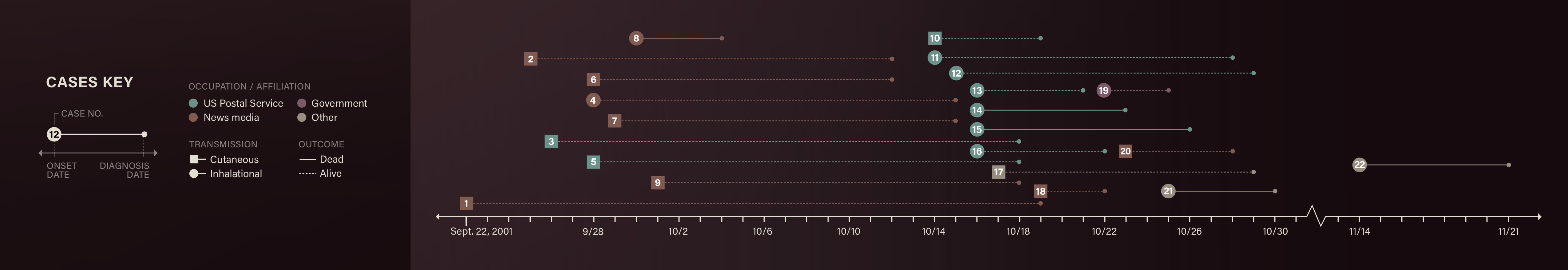 The case data used in this project is based on the epidemiological findings from the Center for Disease Control and Prevention (CDC)'s Investigation of Bioterrorism-Related Anthrax, United States, 2001. To provide additional context, I also incorporated details about when and where the anthrax spore-containing letters were mailed, based on the timeline in the United States Department of Justice's Amerithrax Investigative Summary.