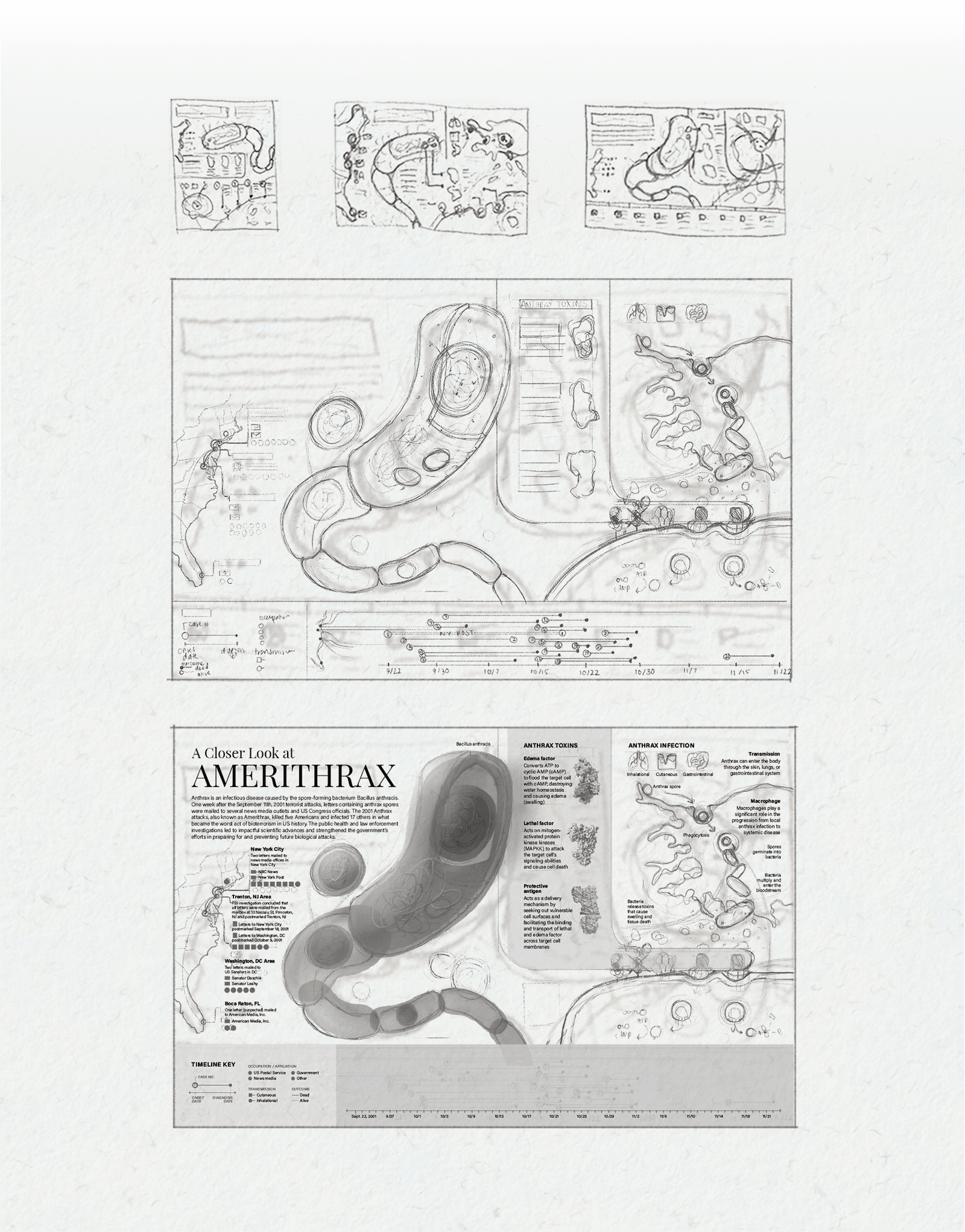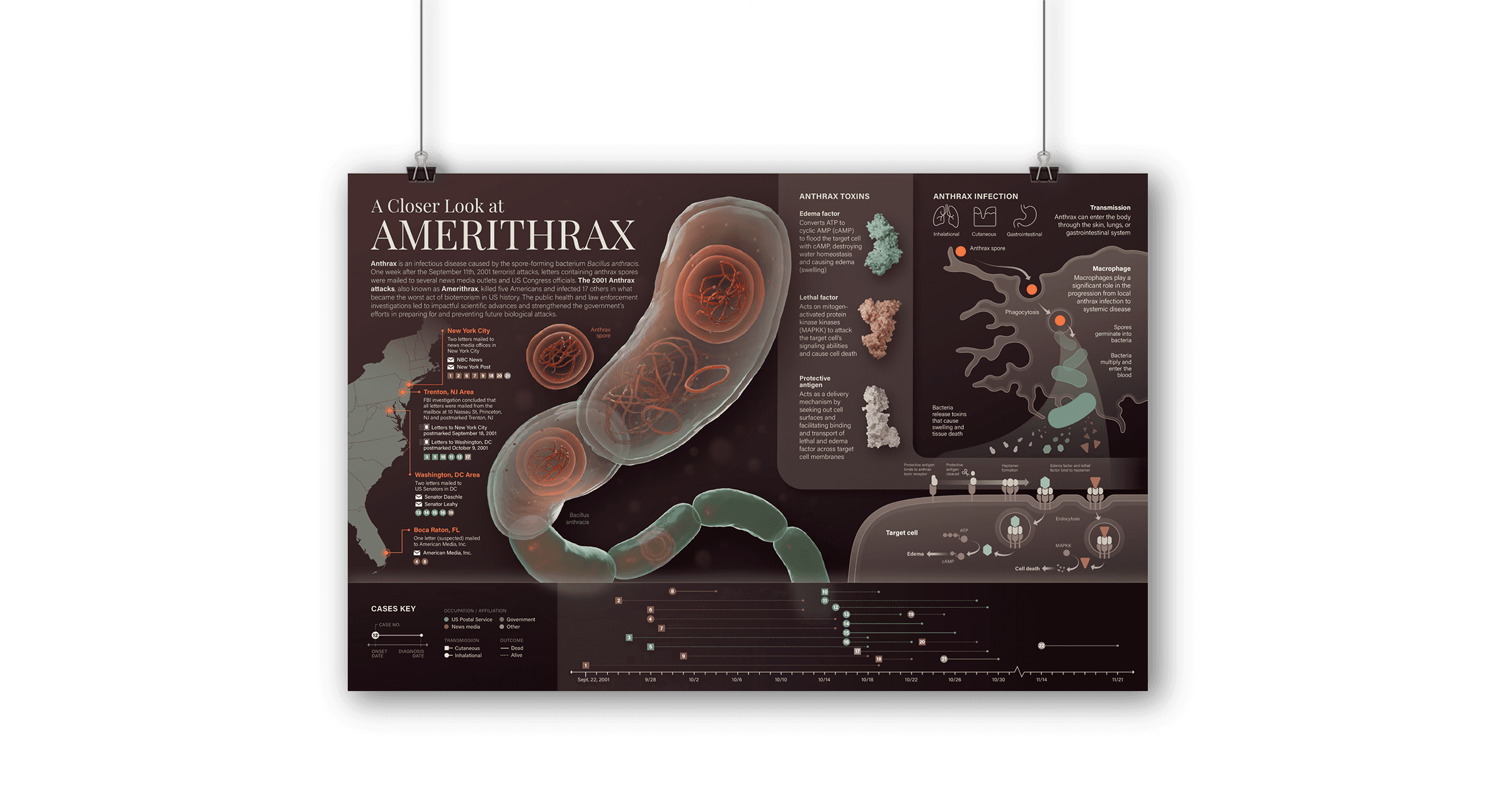 Focusing on the biology of anthrax infection and epidemiologic timeline of cases, my process integrated data visualization, 3D modelling, molecular visualization, and biological pathway illustration to create a visually compelling scientific story.