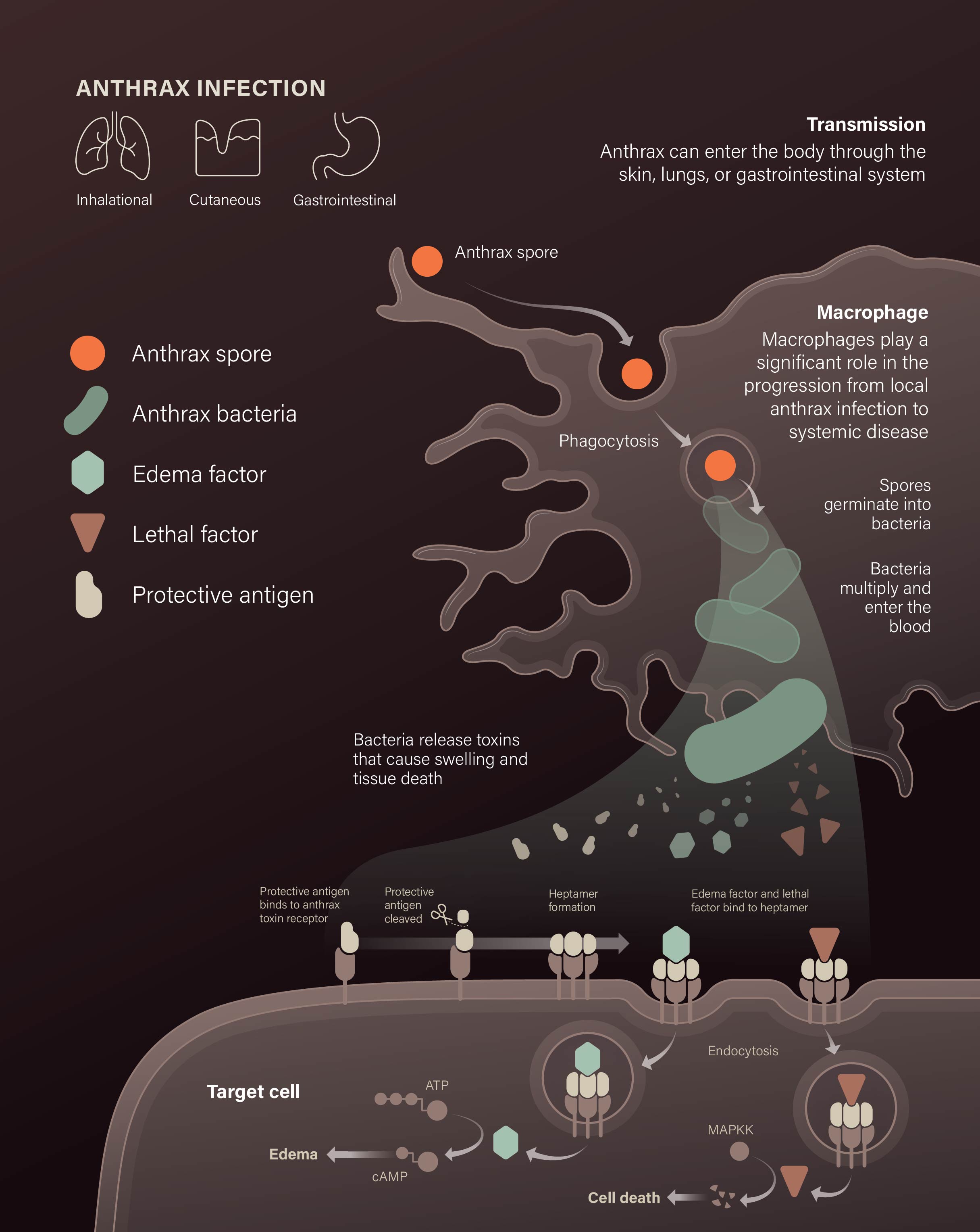 In contrast to the intricate 3D models of the bacteria and toxin proteins, I decided to illustrate the pathogenic pathway of anthrax using a simple schematic style. Each icon's color corresponds to its respective 3D model elsewhere in the infographic.