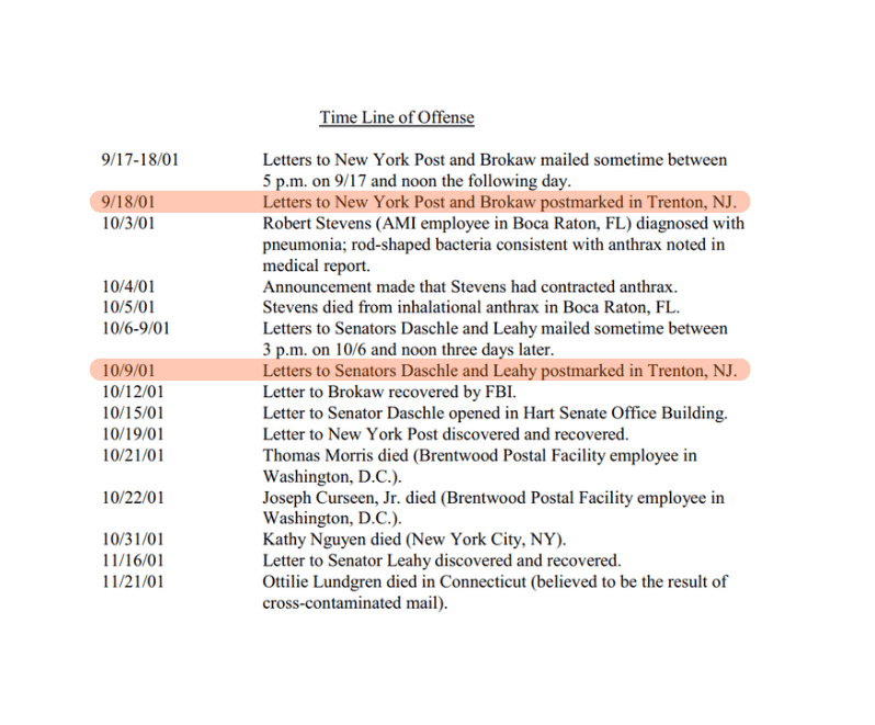 Anthrax is an infectious disease caused by the spore-forming bacterium Bacillus anthracis. One week after the September 11, 2001 terrorist attacks, letters containing anthrax spores were mailed to several news media outlets and US Congress officials. The 2001 Anthrax attacks, also known as Amerithrax, killed five Americans and infected 17 others in what became the worst act of bioterrorism in US history. The public health and law enforcement investigations led to impactful scientific advances and strengthened the government's efforts in preparing for and preventing future biological attacks.