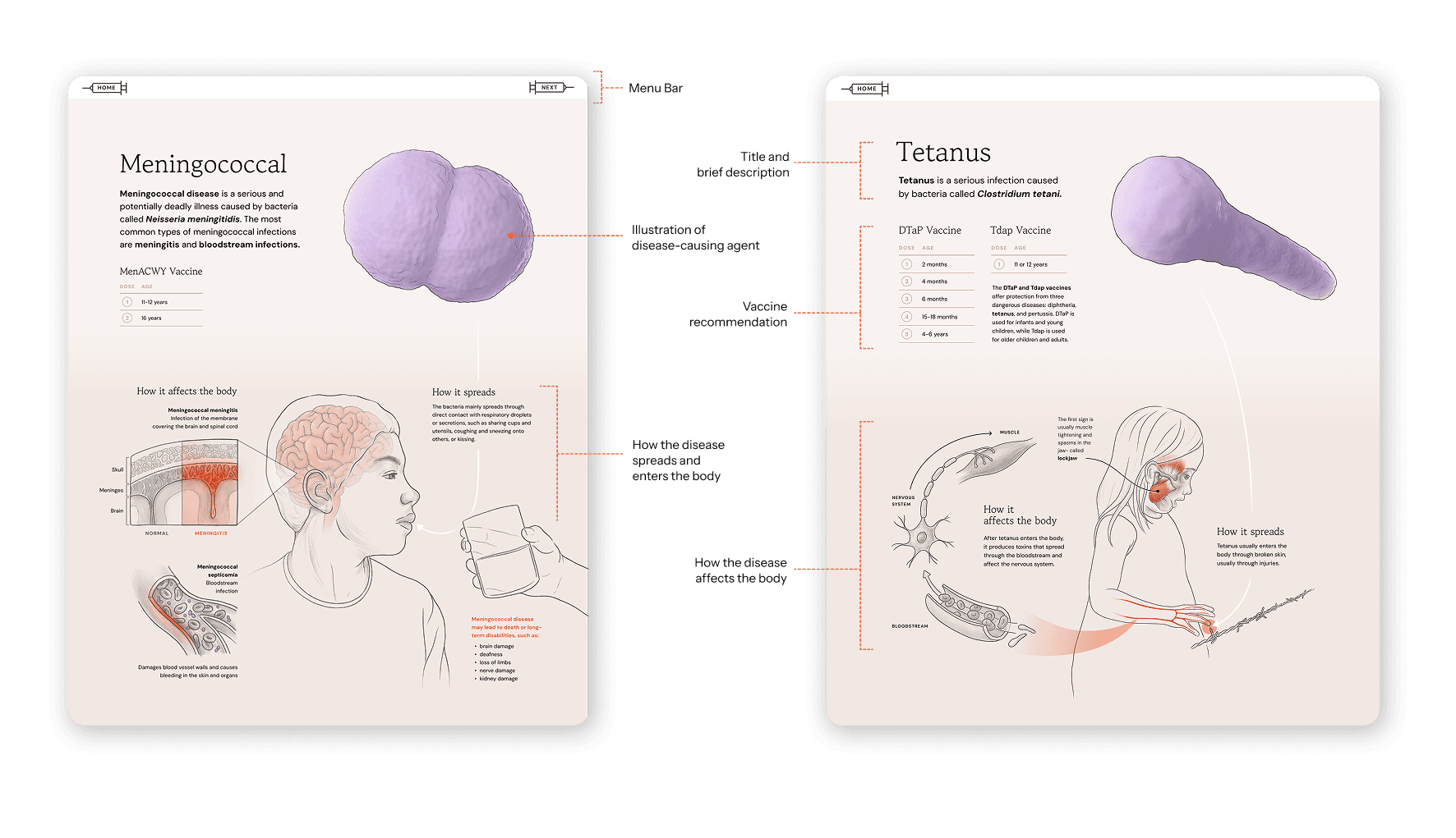 The home page consists of buttons leading to pages about general vaccine info, as well as a menu to navigate to pages about specific diseases/vaccines.
