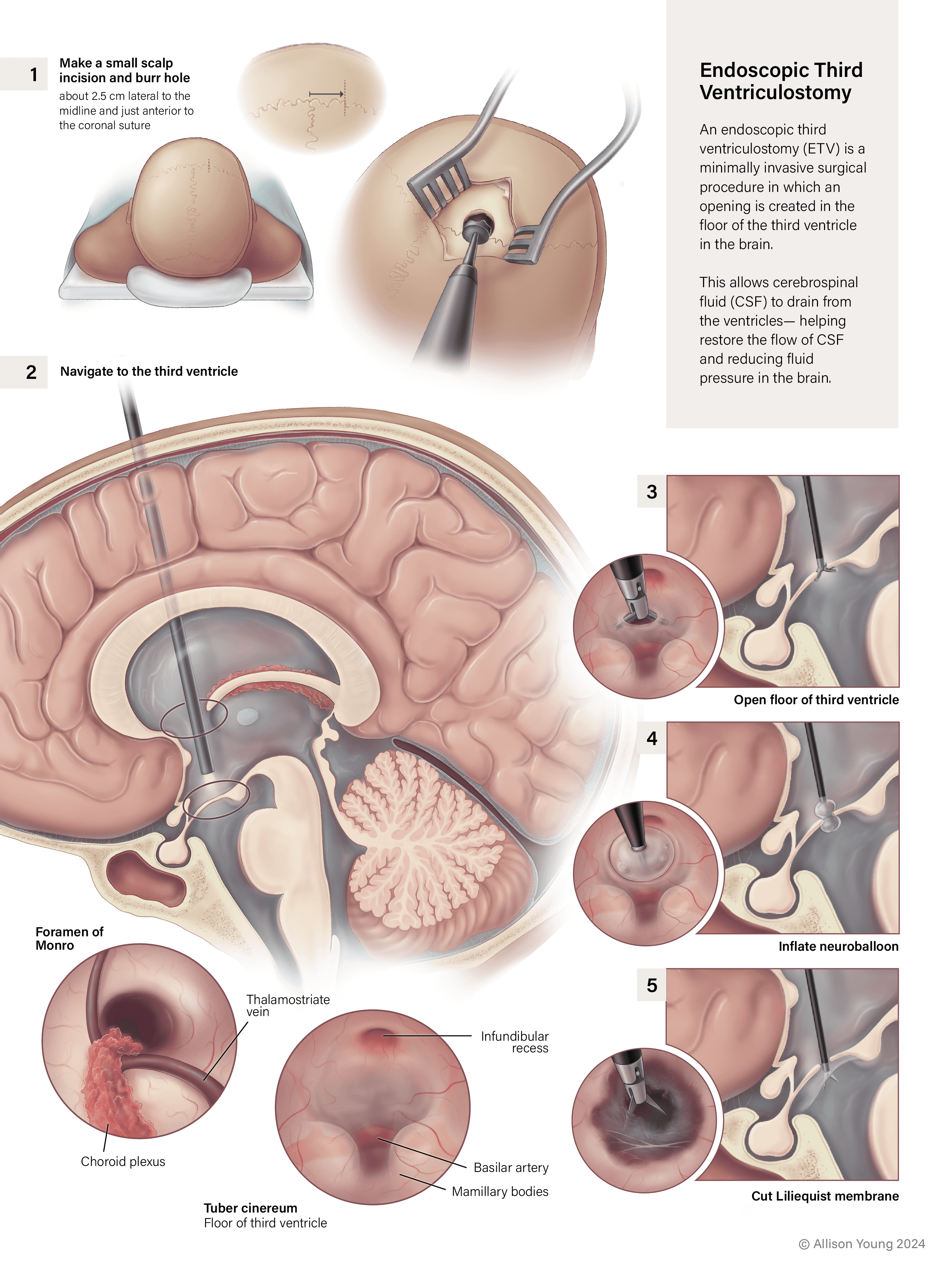 An endoscopic third ventriculostomy (ETV) is a minimally invasive surgical procedure in which an opening is created in the floor of the third ventricle in the brain. This allows cerebrospinal fluid (CSF) to drain from the ventricles— helping restore the flow of CSF and reducing fluid pressure in the brain.