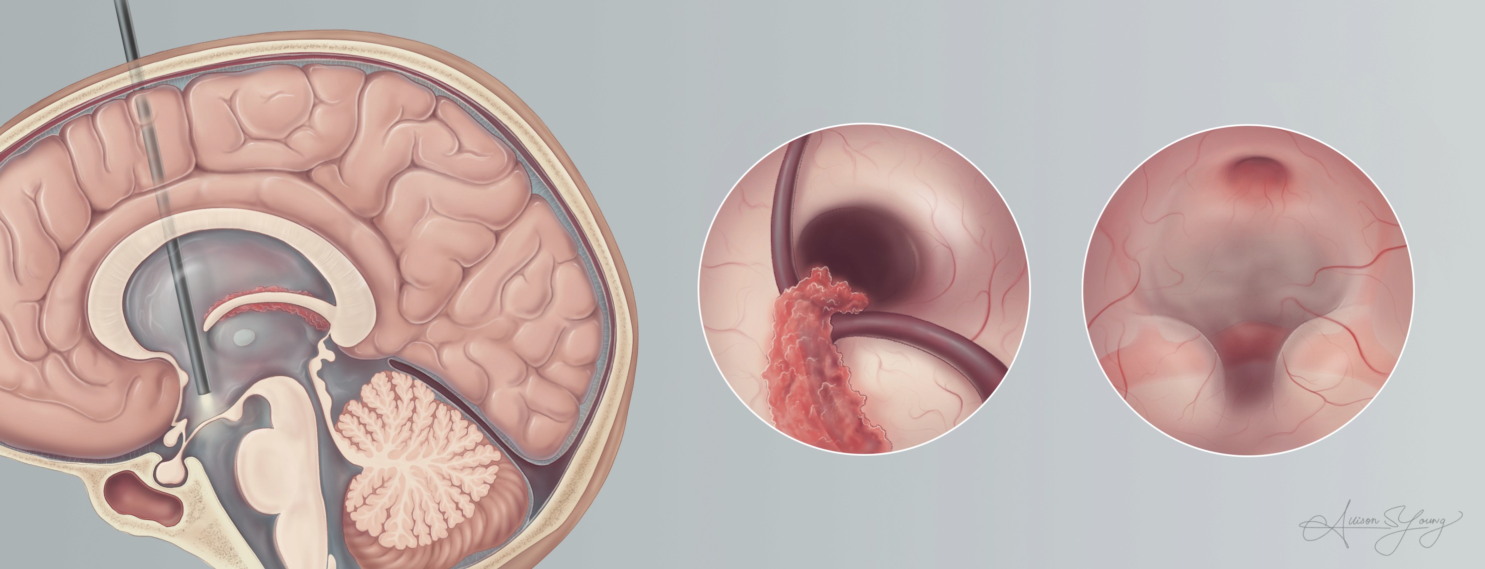 In this illustrated surgical sequence page layout, I broke down the procedure into 5 steps. For each step (aside from the initial incision), I illustrated both an endoscopic view as well as a midsagittal view to help provide anatomical orientation.