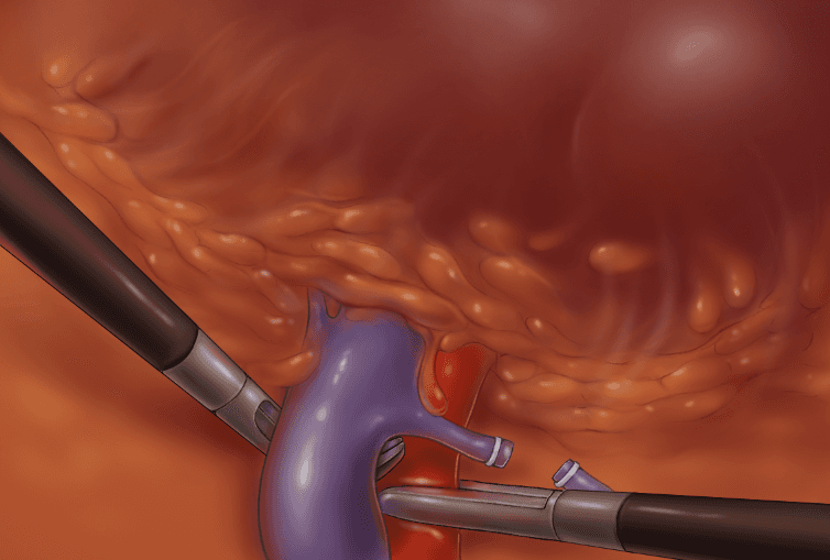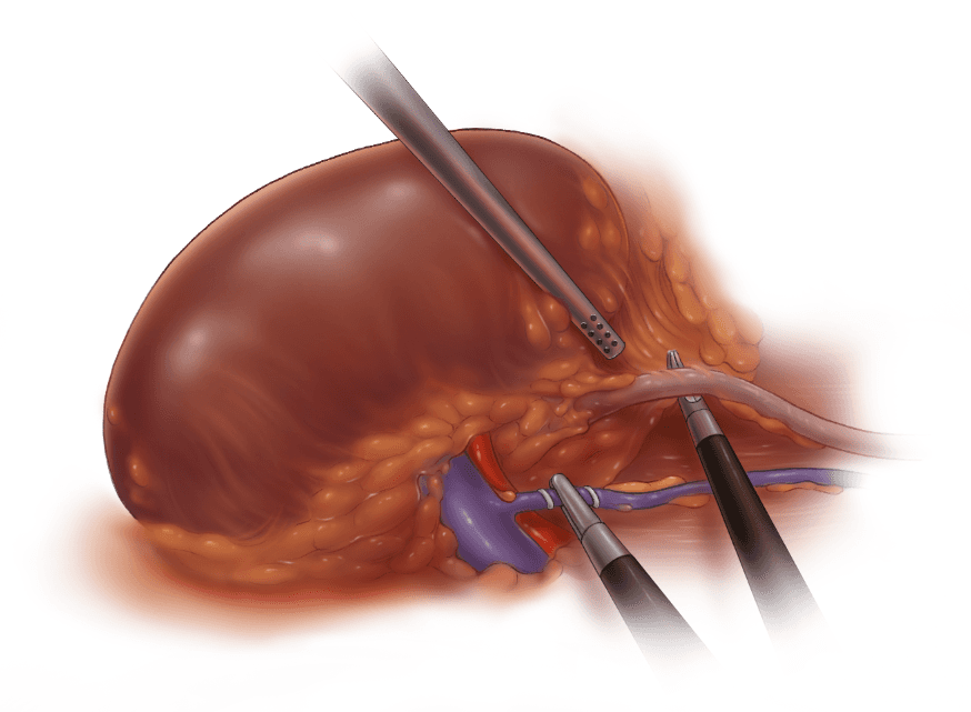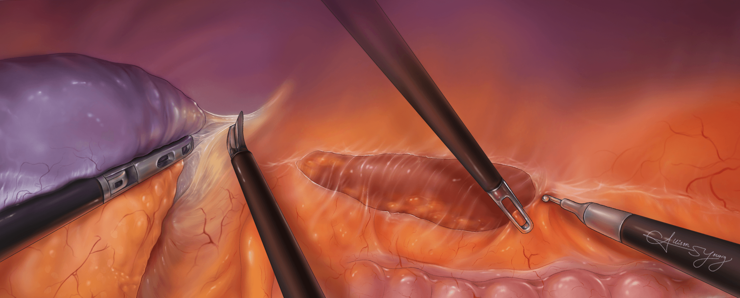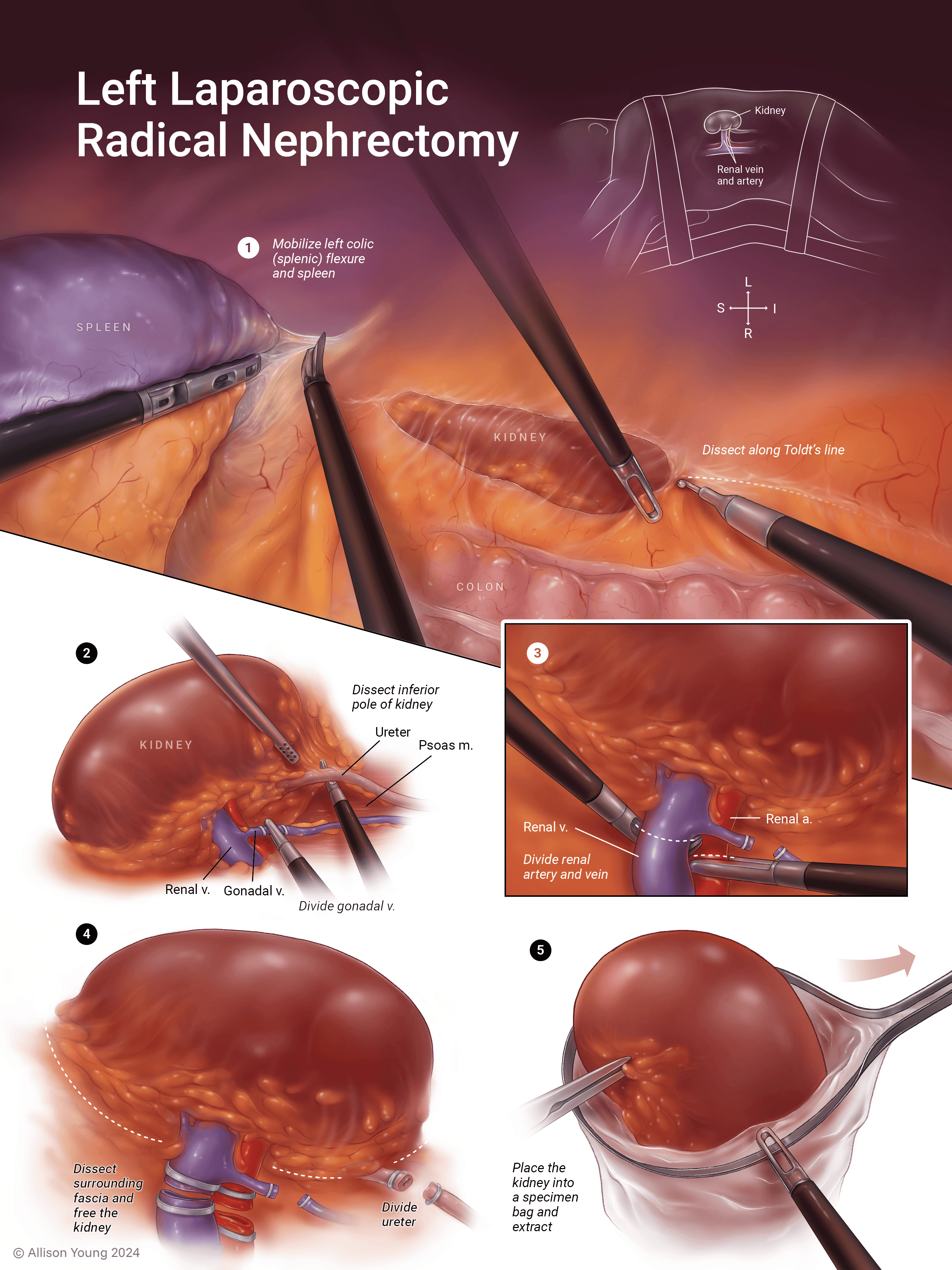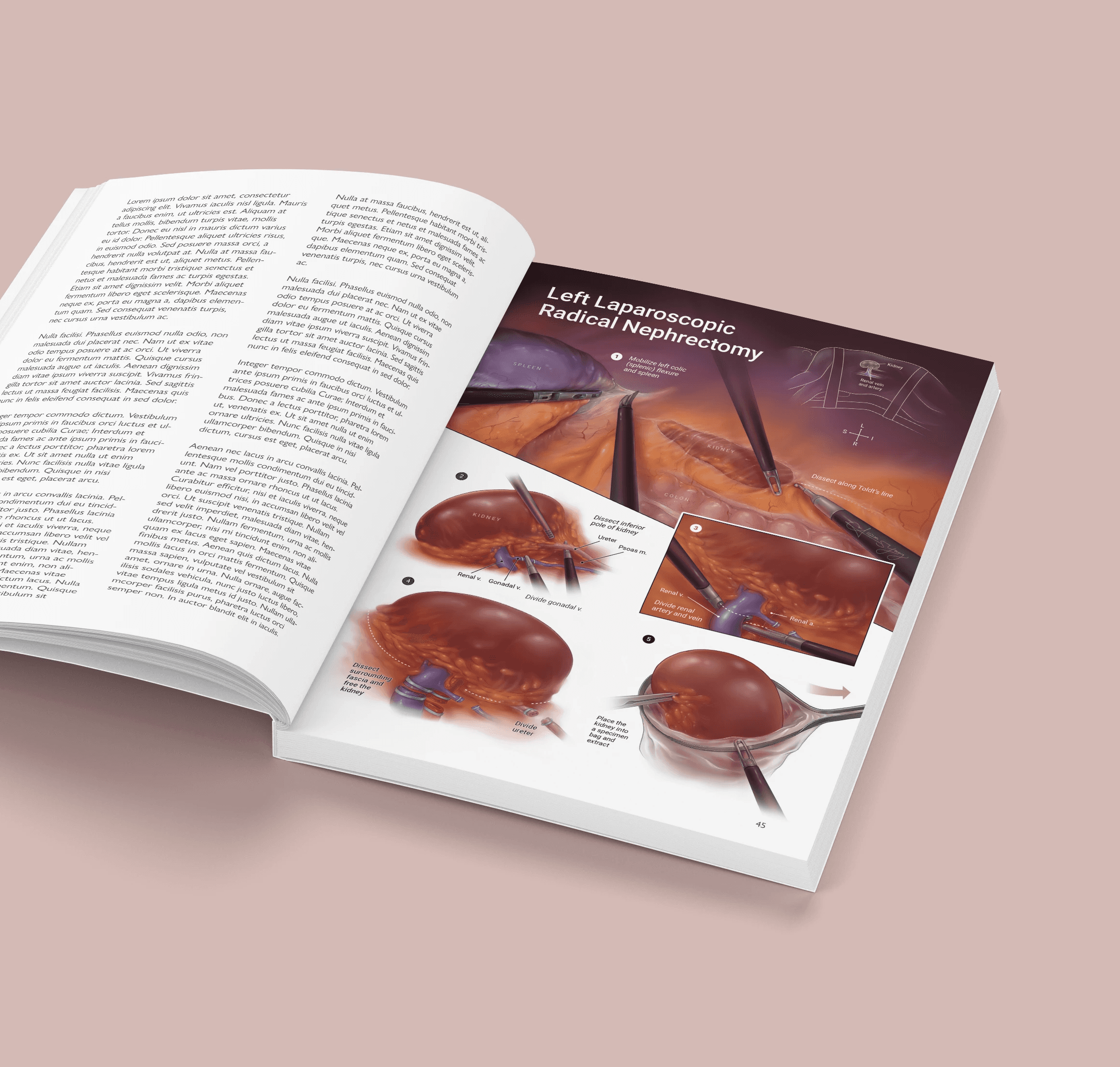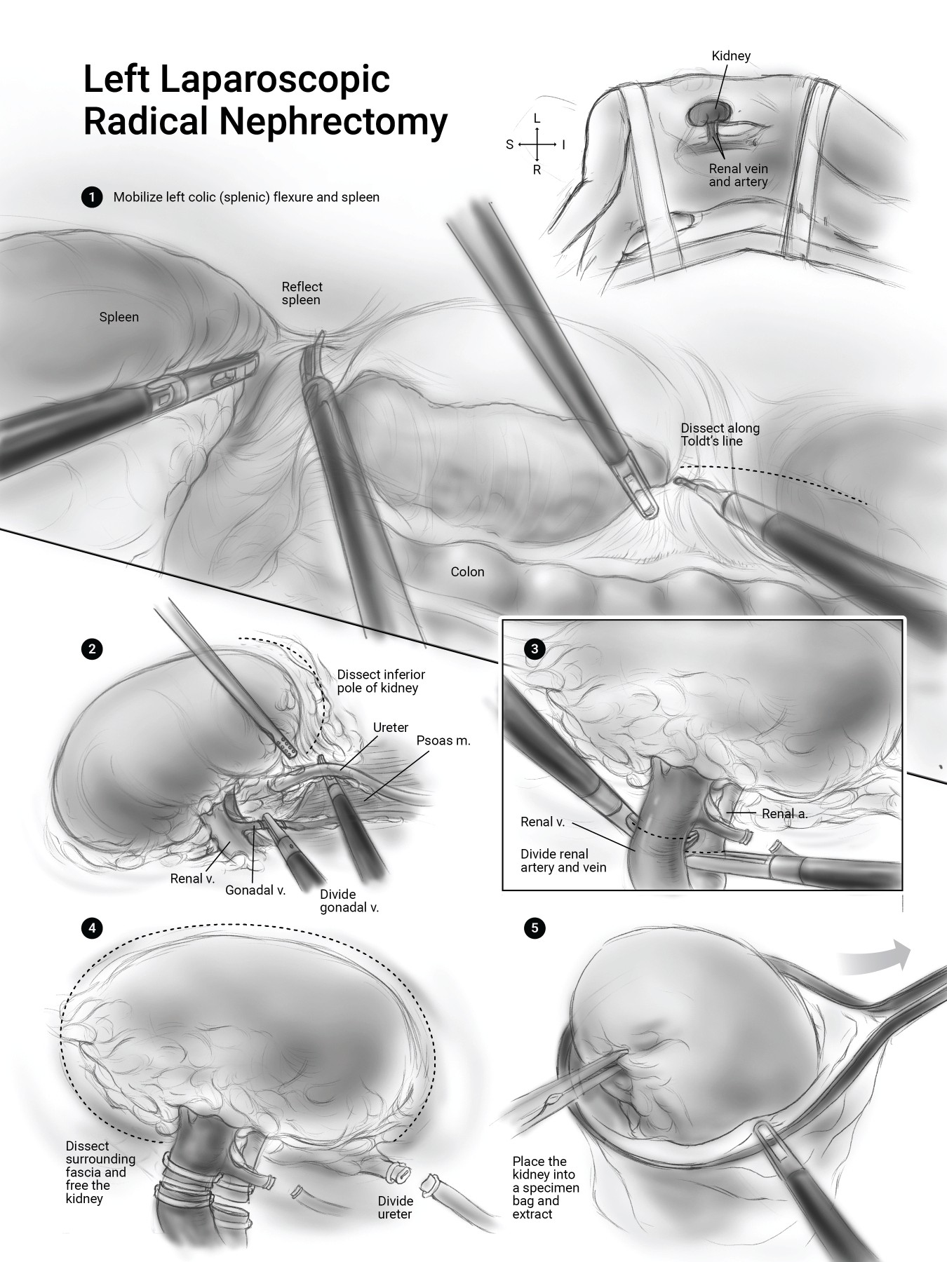 This surgical illustration piece breaks down a left laparoscopic radical nephrectomy procedure into 5 key steps. In this minimally invasive procedure, the entire left kidney is dissected and removed from the body. I had the opportunity to see this surgery and create rough sketches while in the operating room; after additional supplementary research, I transformed those sketches into surgical step illustrations.