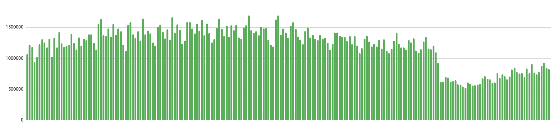 I created two sets of data visualizations, one showing ridership over time and the other exploring seasonal trends. When designing the graphs I used narrowly spaced thin bars that, together, show broad ridership patterns and also stylistically resemble audio waveforms.