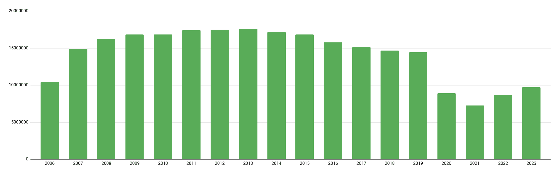 Ridership is defined as the total number of riders, passengers, or boardings– it is measured daily and the dataset provides the monthly total, spanning from April 2006 to December 2023.