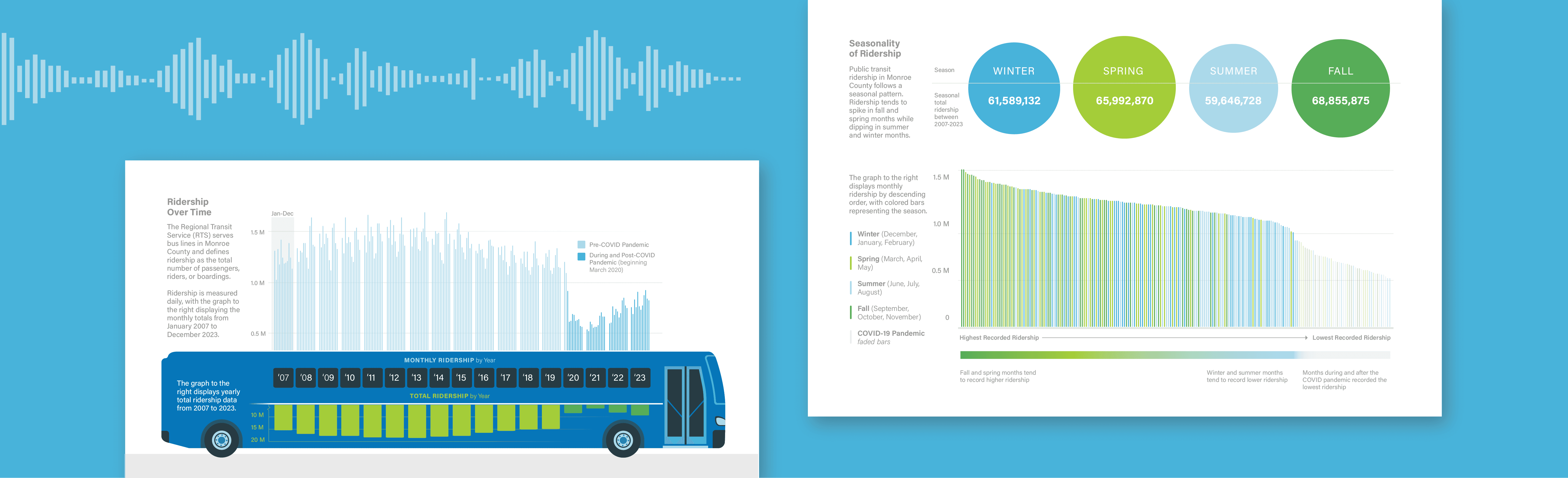 To more closely tie the graphs to the subject matter, I used colors and graphic elements inspired by the blue and green RTS buses on Rochester’s roads.