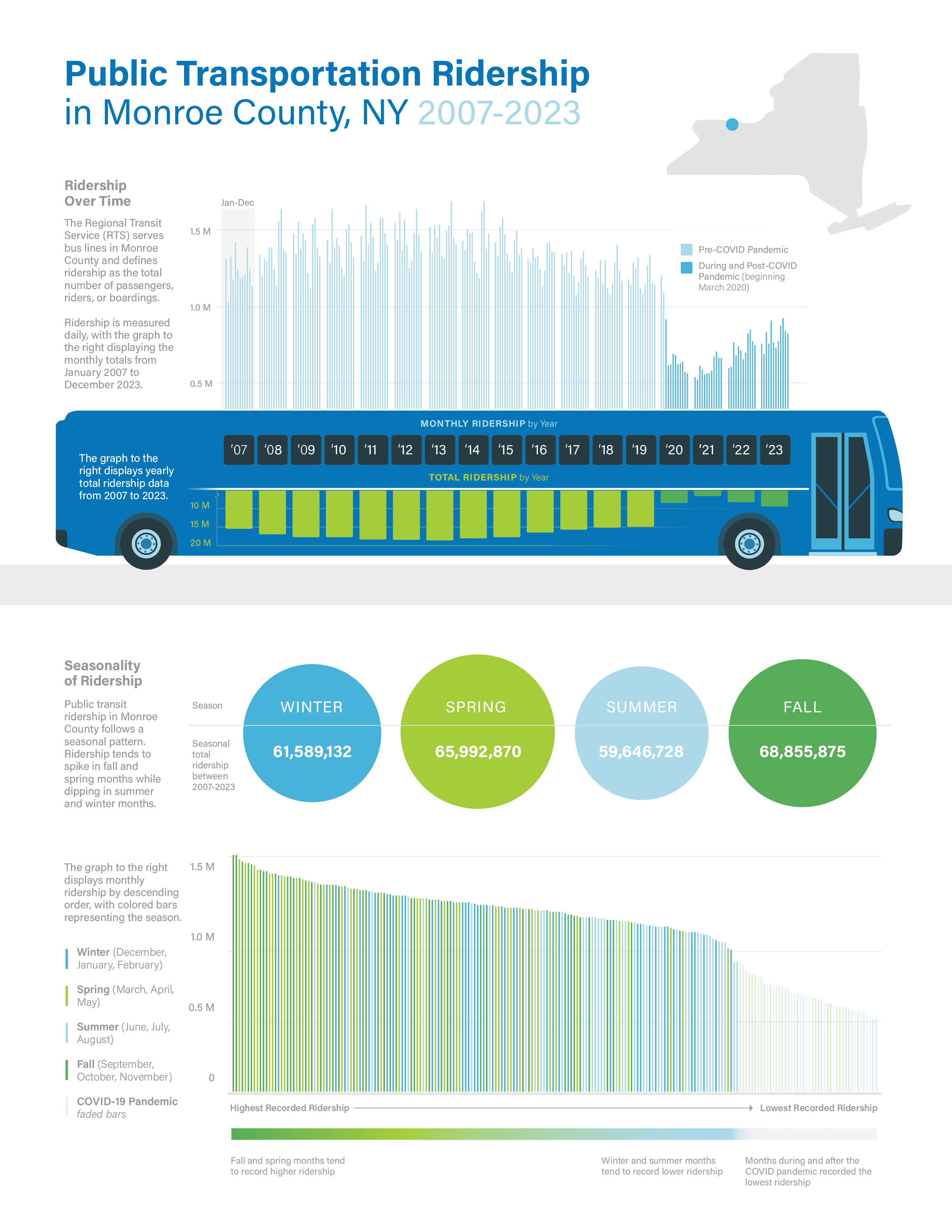 This infographic explores trends and changes in RTS ridership, focusing particularly on seasonal patterns and how public transportation ridership in Rochester has changed prior to, during, and post-COVID pandemic.