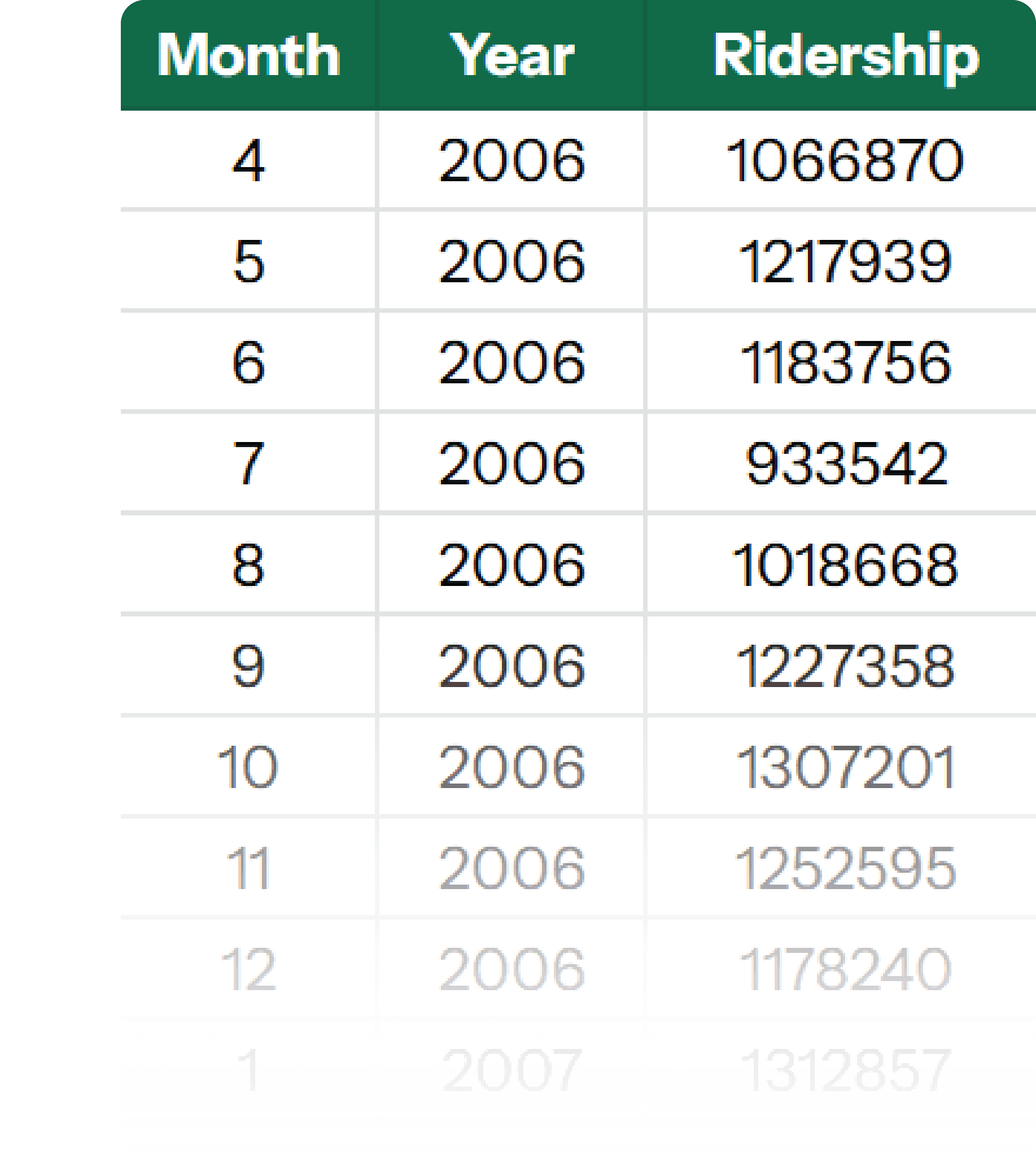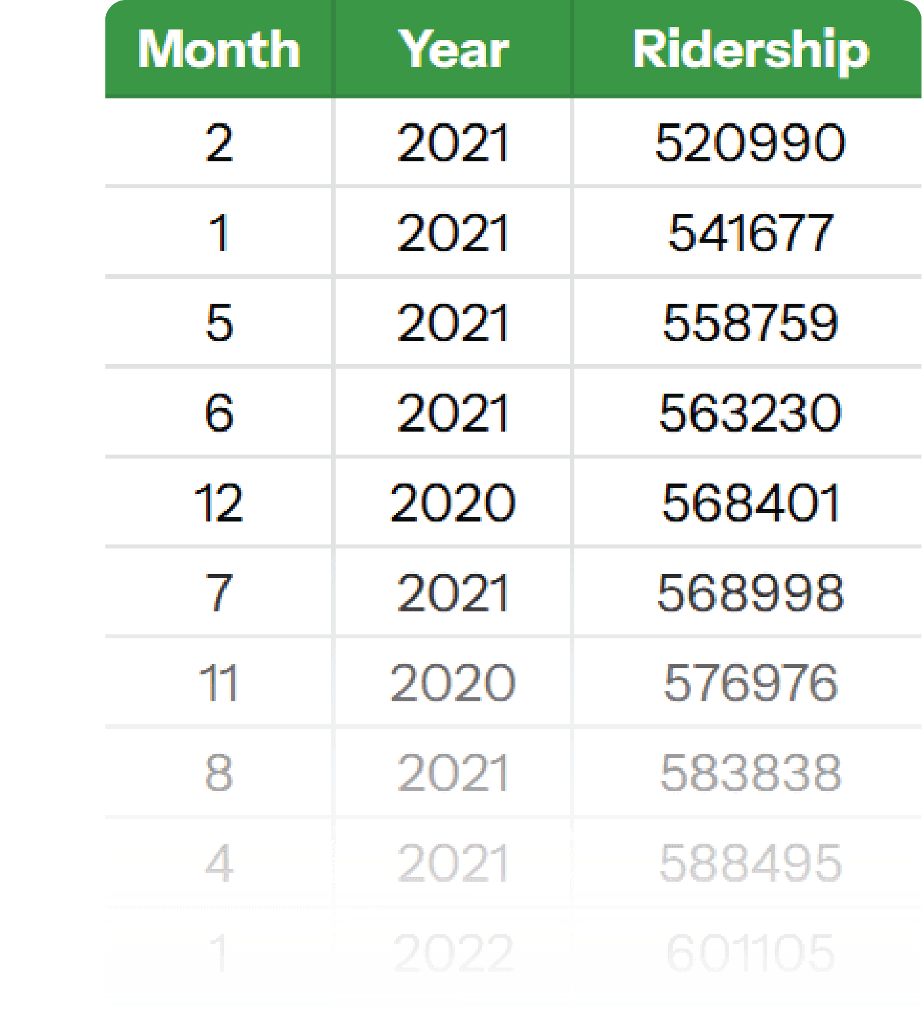 Organizing the rows in chronological order allowed me to see how ridership changed over time