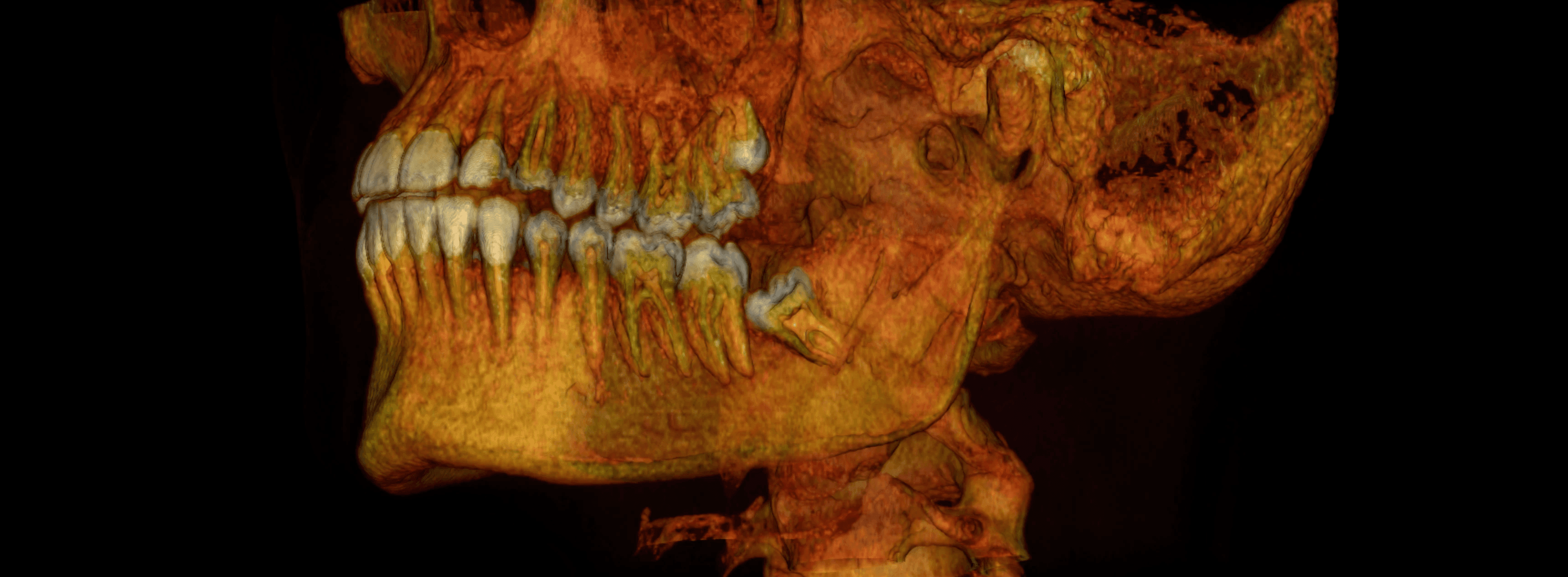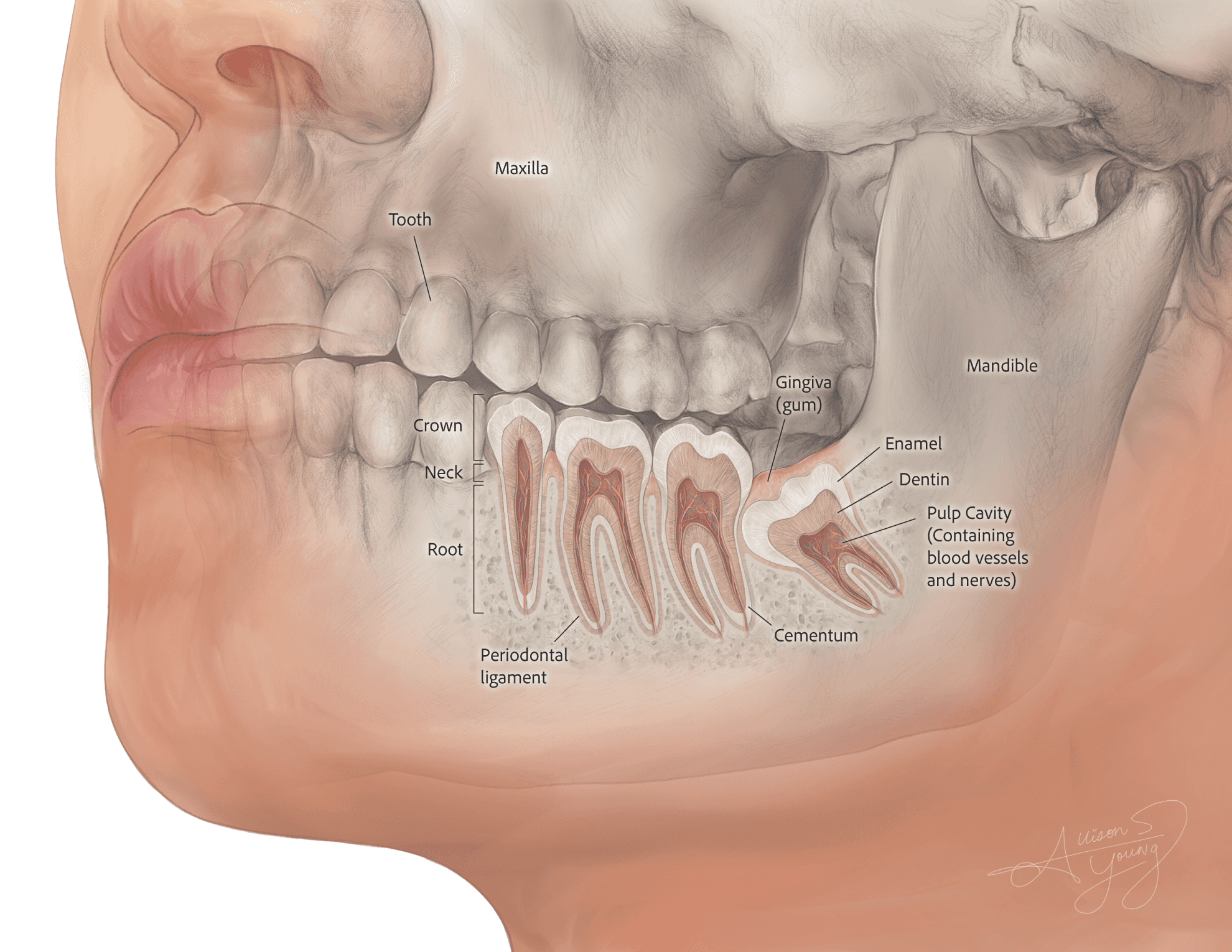 Illustration about the parts of a tooth and surrounding bones, created using CT scans as reference.
