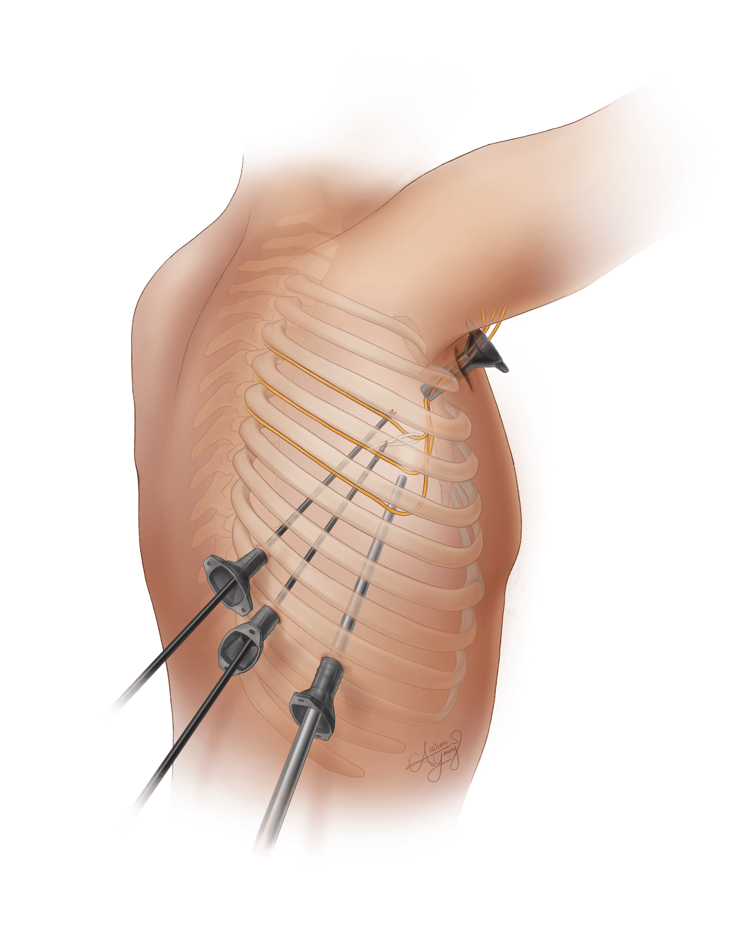 Posterior-lateral view showing the minimally invasive incisions and nerves being tunneled out of the thorax
