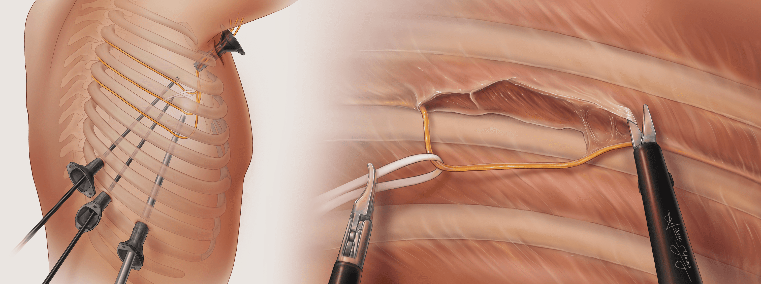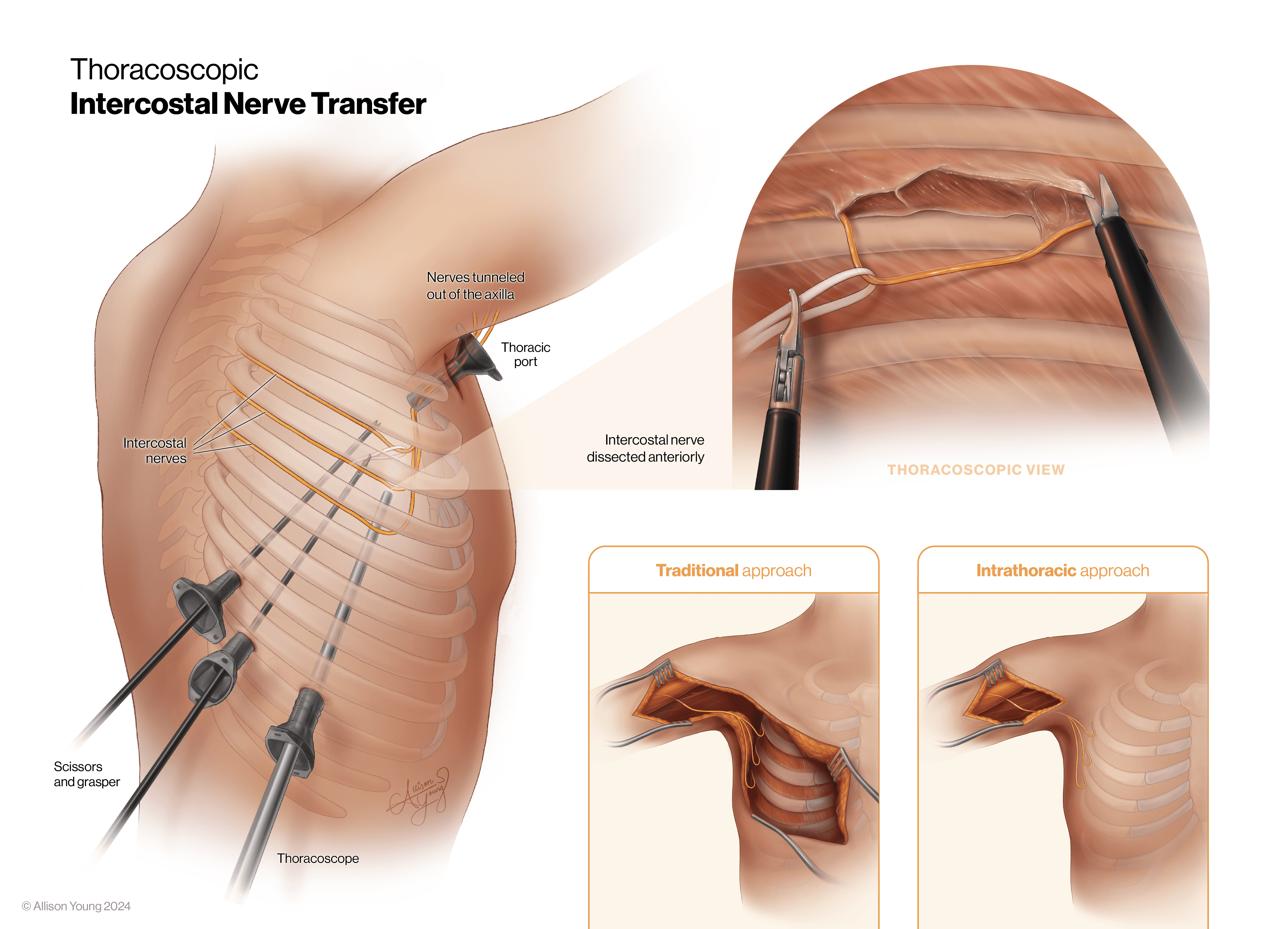 This series depicts a video-assisted thoracoscopic surgery (VATS) technique for intercostal (ribs) nerve harvest and transfer to the musculocutaneous nerve, which innervates the biceps brachii muscle in the arm. The nerve transfer allows for elbow flexion to be restored following brachial plexus injuries.